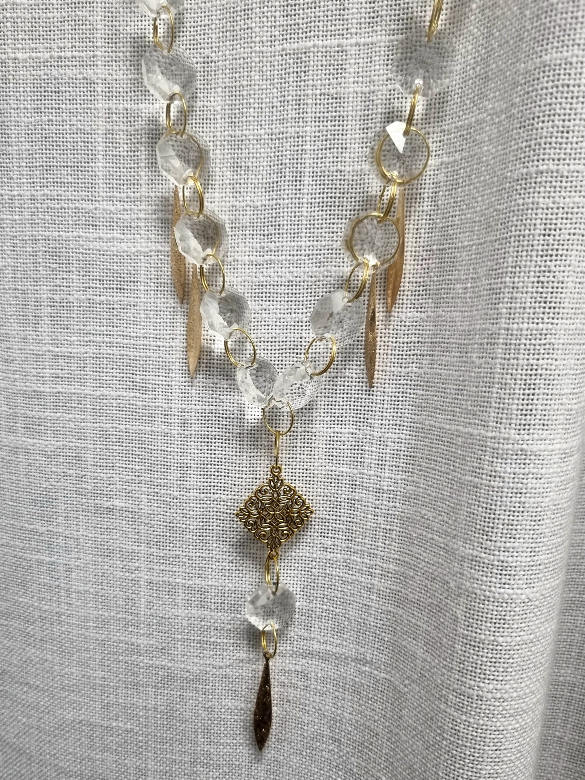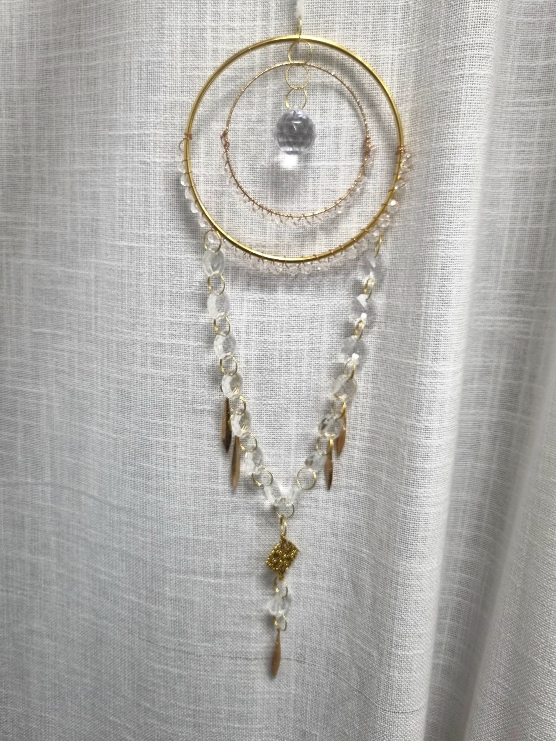 Chaque pièce est montée à la main avec soin, ce qui rend chaque création unique. Au centre, une délicate boule de cristal capte la lumière, entourée de cristaux qui la subliment.