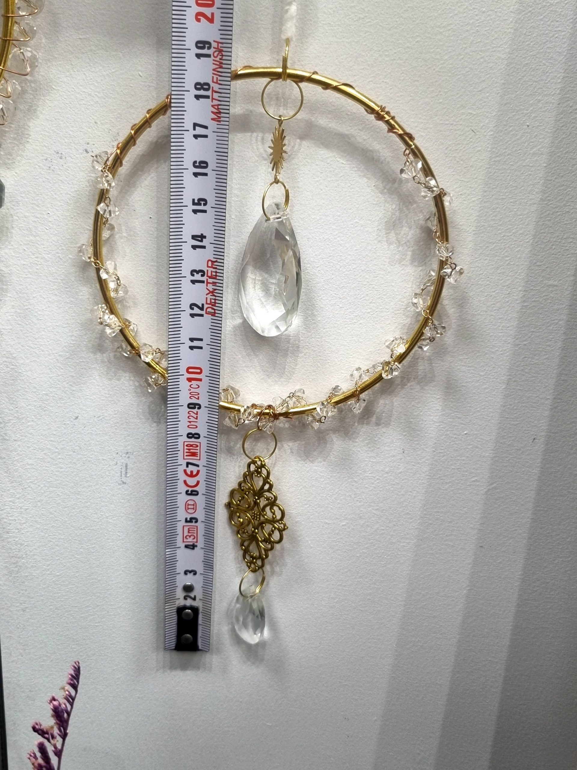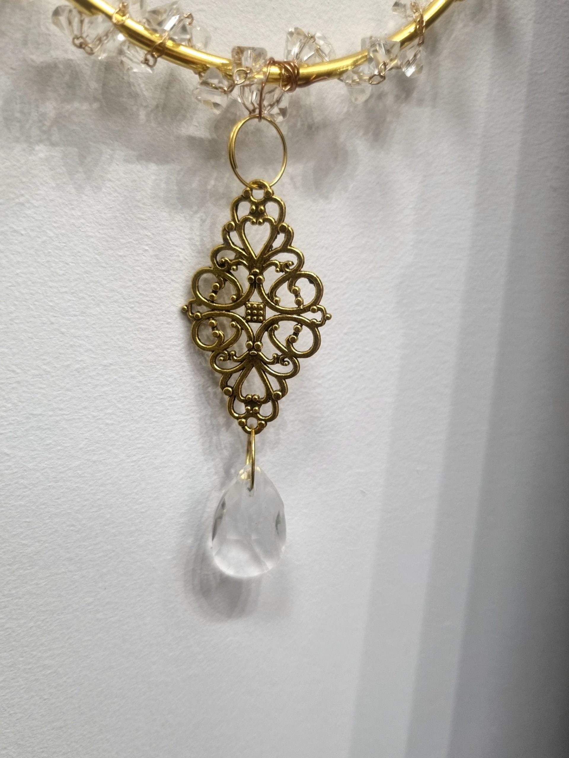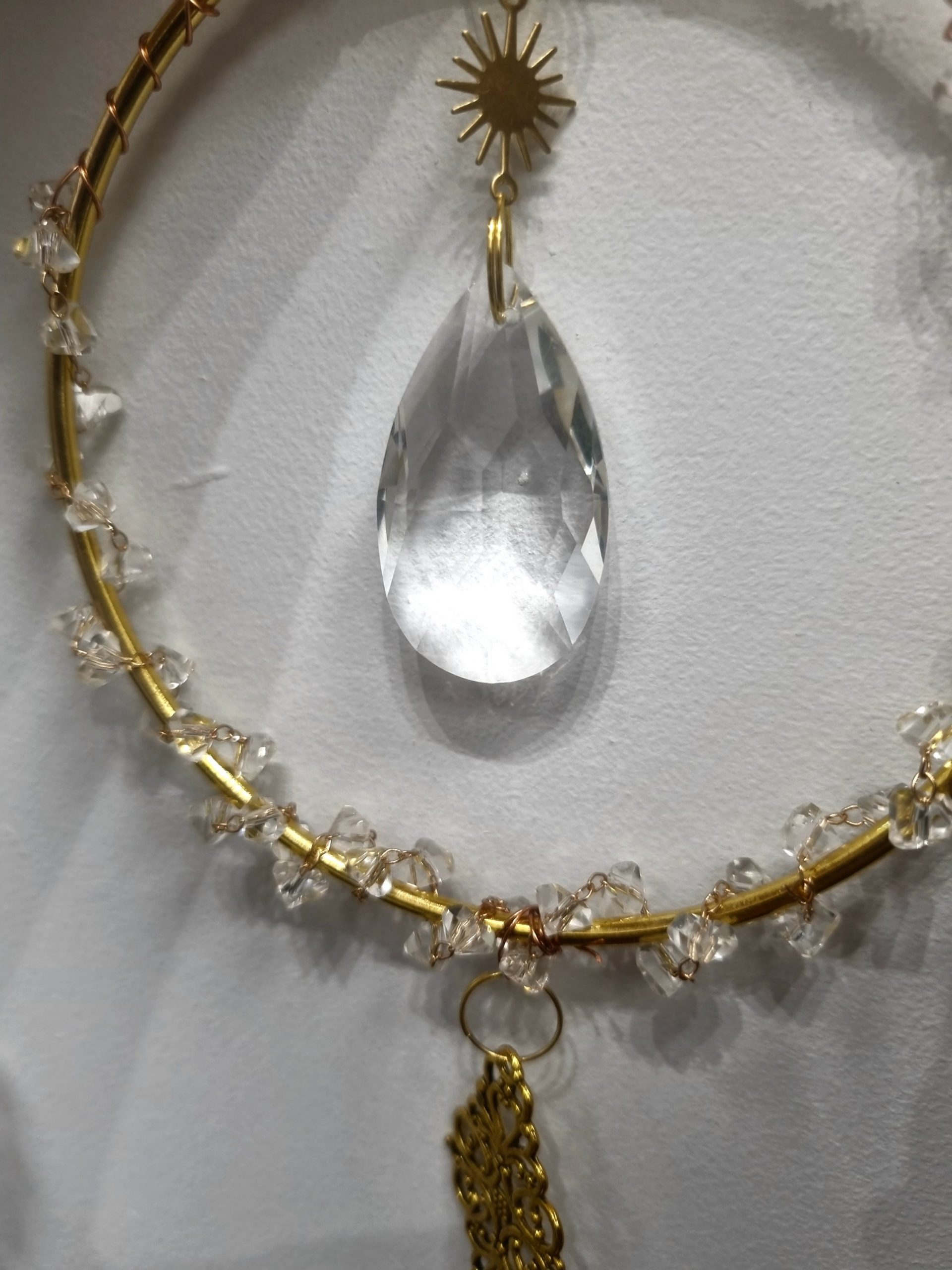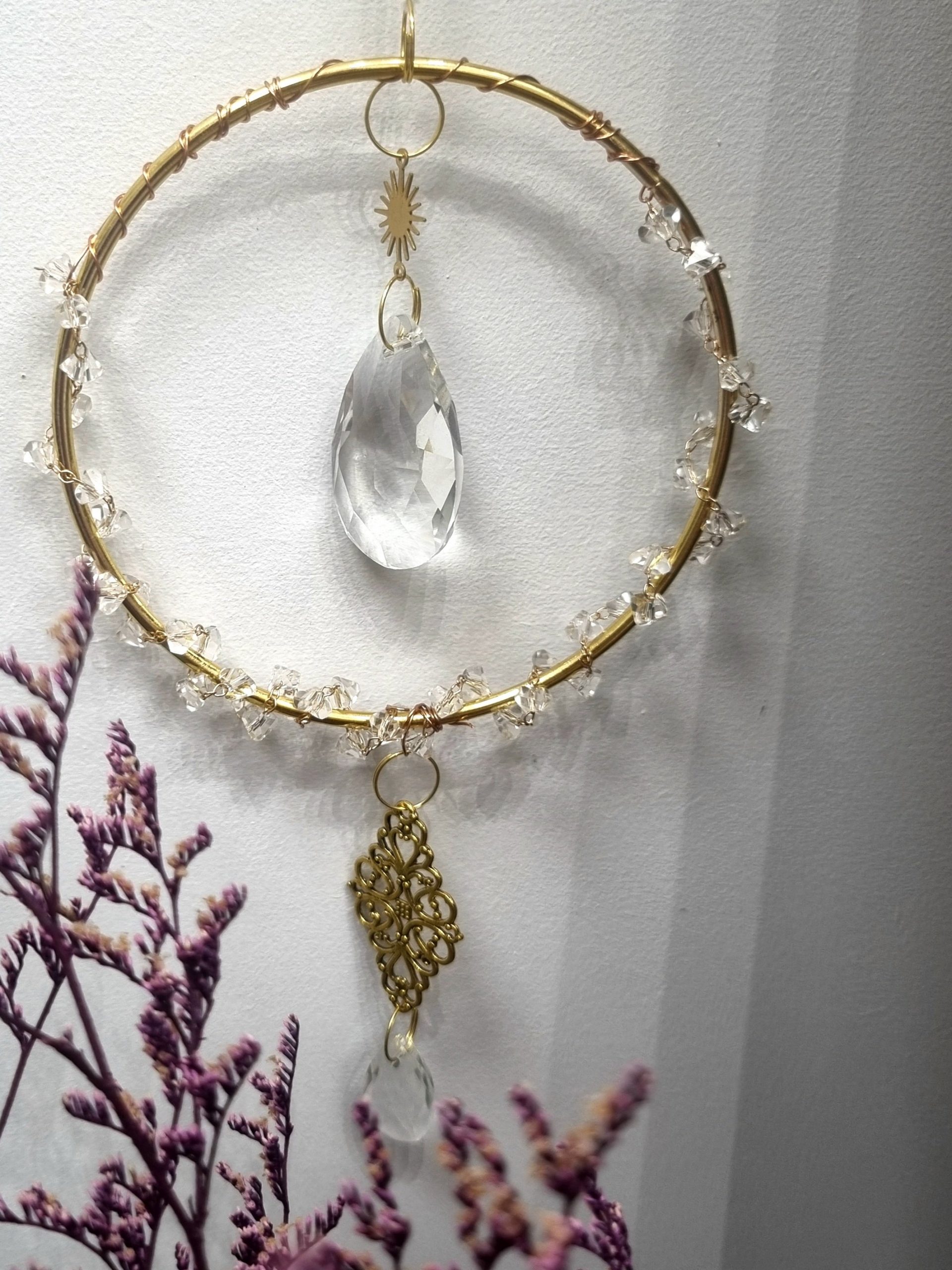 Chaque pièce est montée à la main avec soin, ce qui rend chaque création unique. Au centre, une délicate boule de cristal capte la lumière, entourée de cristaux qui la subliment.