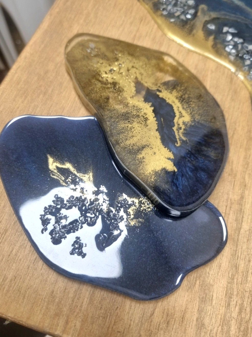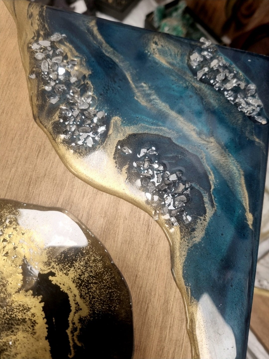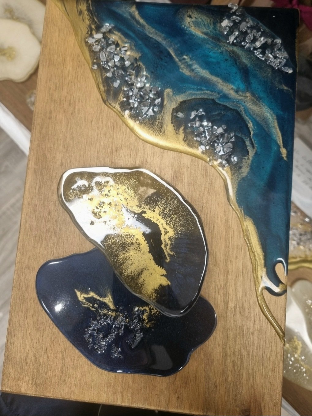 Ce coffret aux nuances de bleu, sublimé par des touches dorées et des cristaux, révèle un style à la fois délicat et raffiné. Il contient une planche de 20 × 30 cm ainsi que des dessous de verre assortis. Chaque coffret est une création unique.