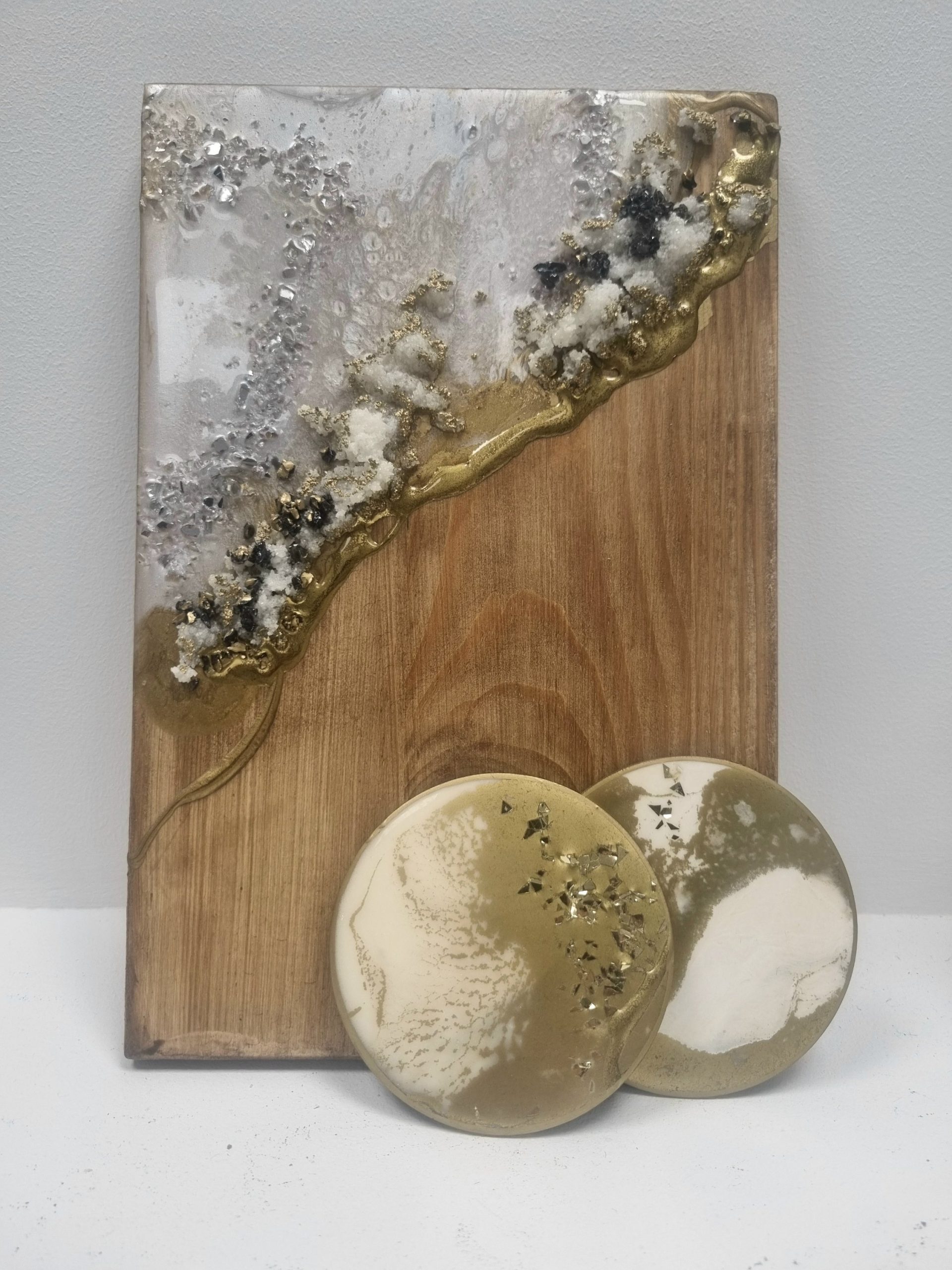Une petite planche à apéro de la collection Agate, réalisée en résine sur bois.Deux dessous de verre effet marbre résine sur bois.