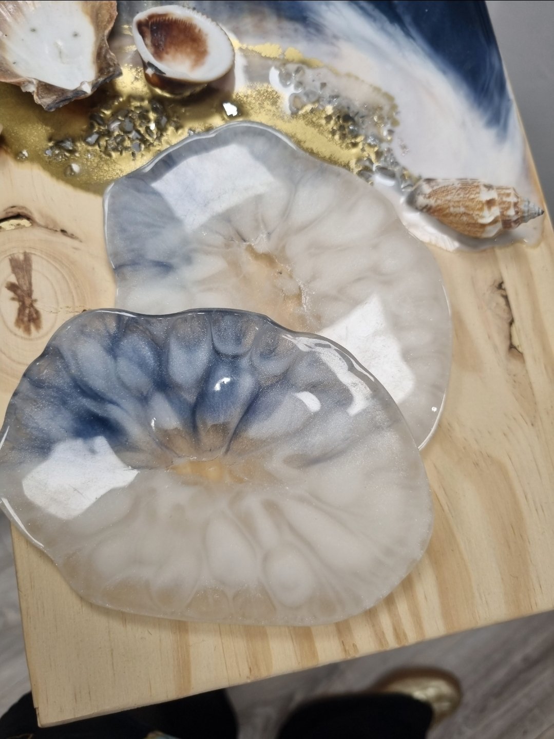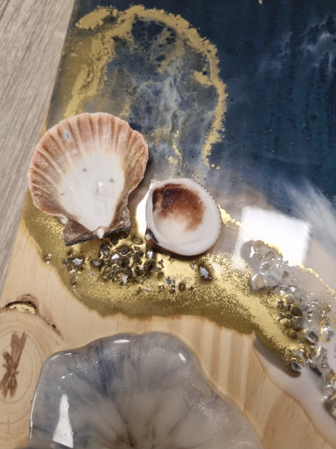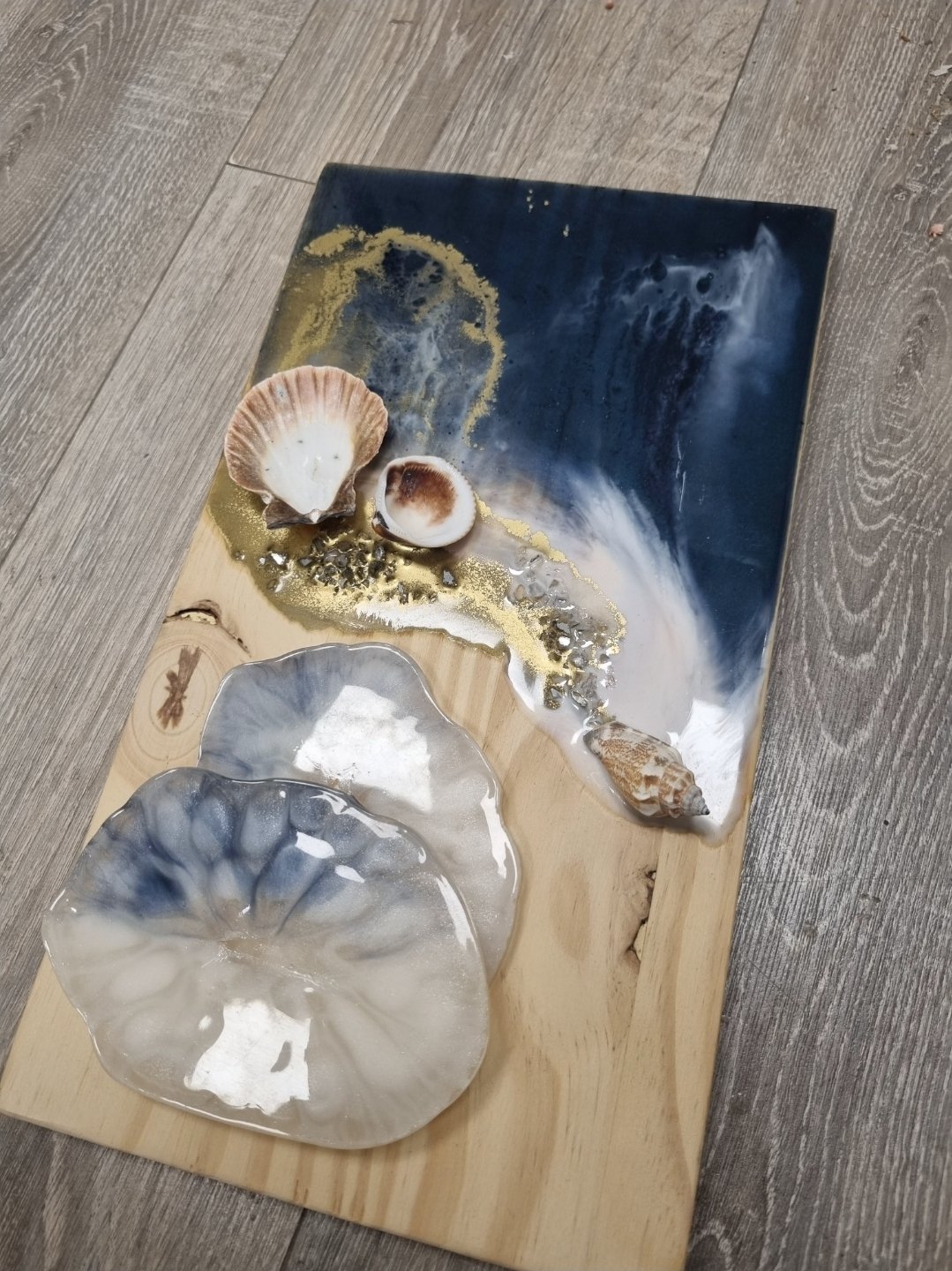 Nos coffrets sont de retour pour la période festive : des planches à apéro en résine effet mer , ornées de cristaux et coquillages alliant textures et relief pour une décoration fonctionnelle et unique.