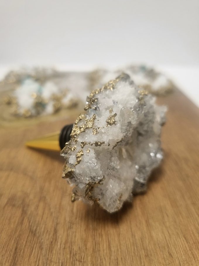 Un bouchon de bouteille Inspiré par la beauté minérale avec des cristaux et minéraux intégrés.