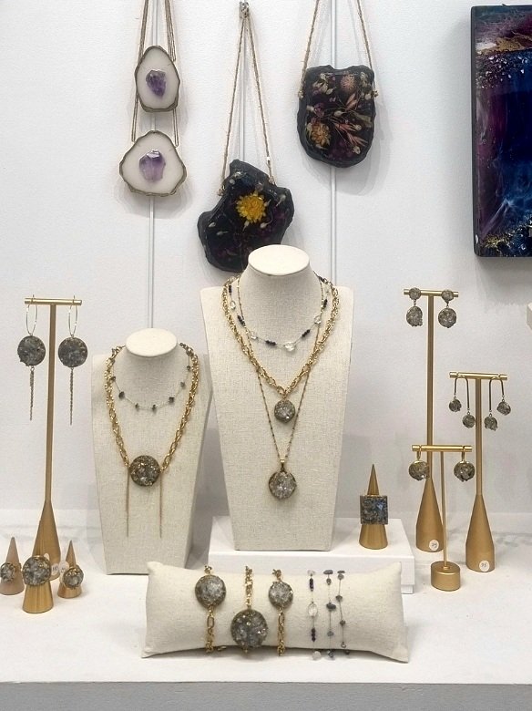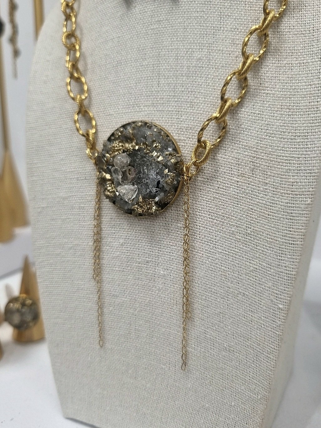 Collier tour de cou aux grosses mailles dorées, rehaussé d’un grand pendentif, orné d’une fine chaîne délicate. La pierre centrale, un quartz blanc naturel monté sur base minérale, est façonnée à la main. Chaque pendentif est unique, révélant des reflets lumineux et cristallins. Le quartz blanc, pierre de clarté et d’équilibre, est connu pour purifier l’esprit, harmoniser les énergies et renforcer l’intuition. Il apporte une dimension apaisante et lumineuse à ce bijou à la présence forte et sensuelle.