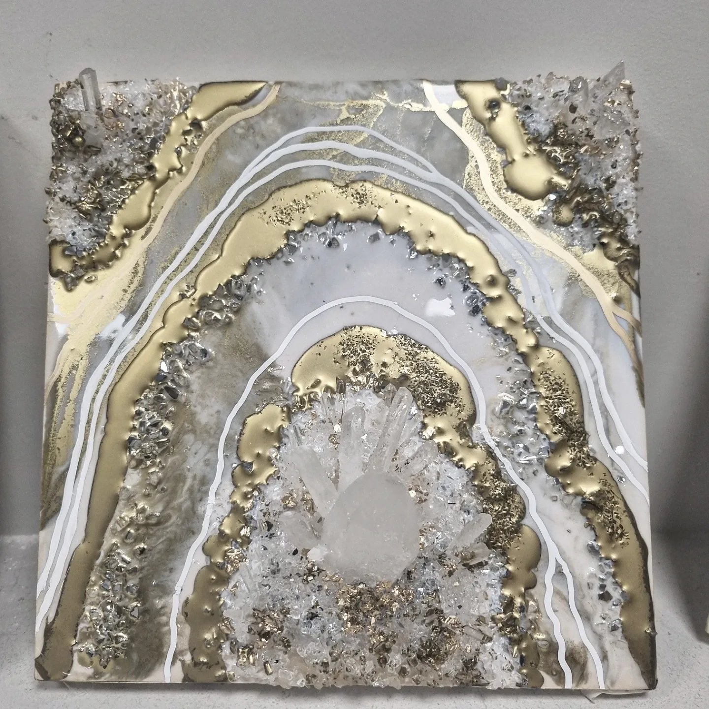 Tableau inspiré par les minéraux avec des points de quartz intégrés .un mariage entre la résine et les minéraux afin de donner vie à l’art par l’énergie. un art avec un but