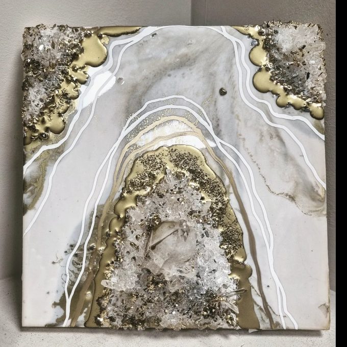 Tableau inspiré par les minéraux avec des points de quartz intégrés .un mariage entre la résine et les minéraux afin de donner vie à l’art par l’énergie. un art avec un but