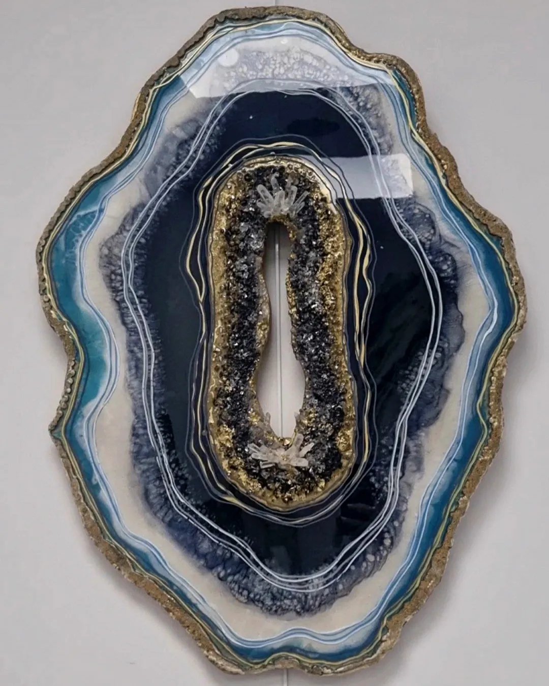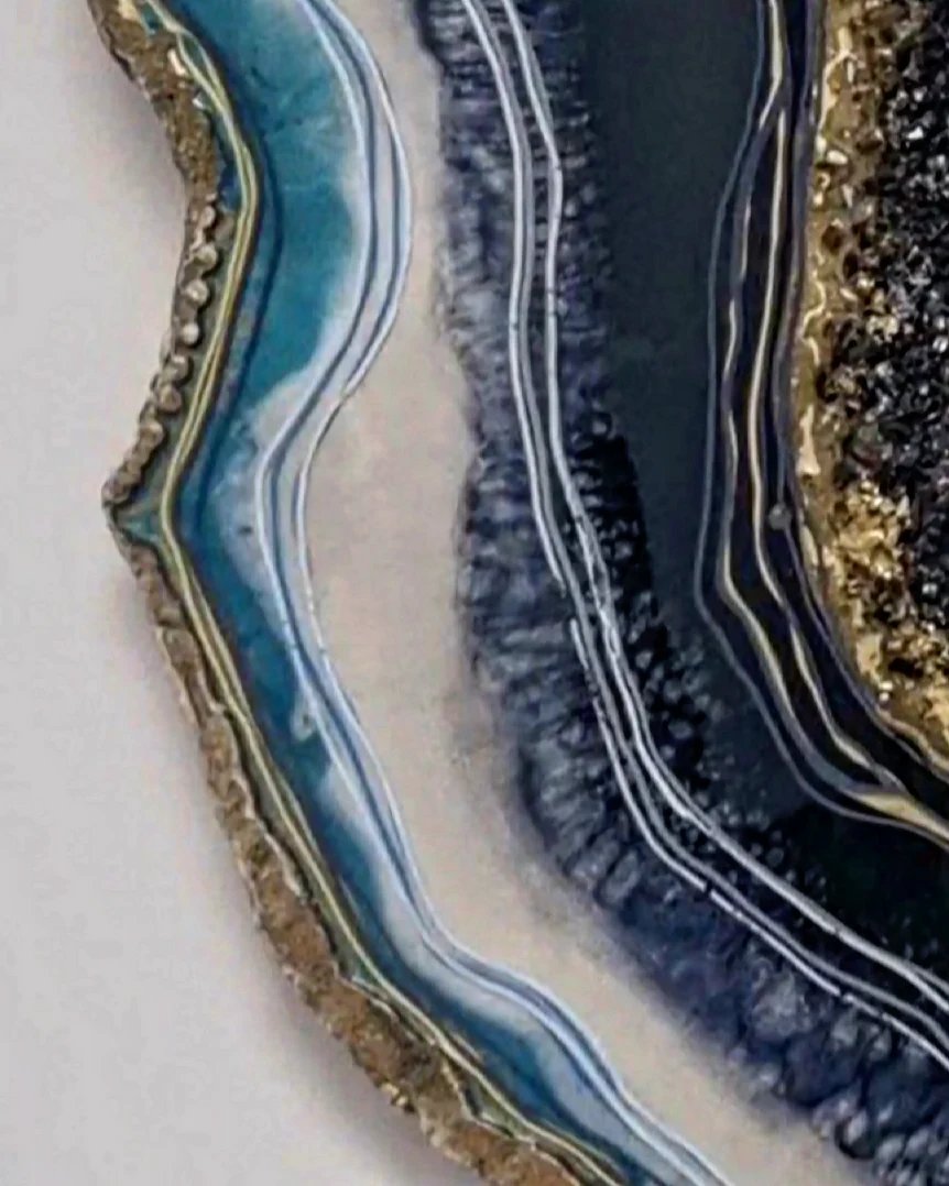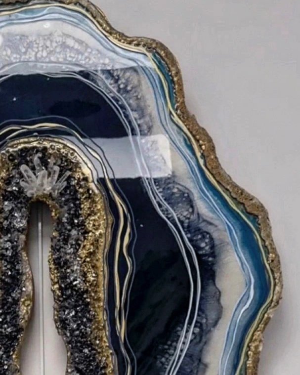 Une fusion de textures et de nuances de bleu se fondent harmonieusement avec des cristaux et des minéraux intégrés dans les couches de résine. Des pointes de quartz transparentes, évoquant la clarté de l’eau, ajoutent une touche unique en libérant l’énergie dans l’espace environnant. Un art avec un but, l’art de l’énergie